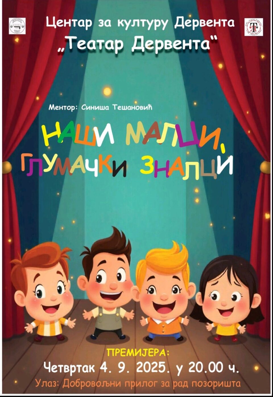 Прва представа домаће продукције „Театра Дервента“, који дјелује под кровом Центра за културу, под називом „Наши малци, глумачки зналци“ биће изведена сутра од 20 часова.