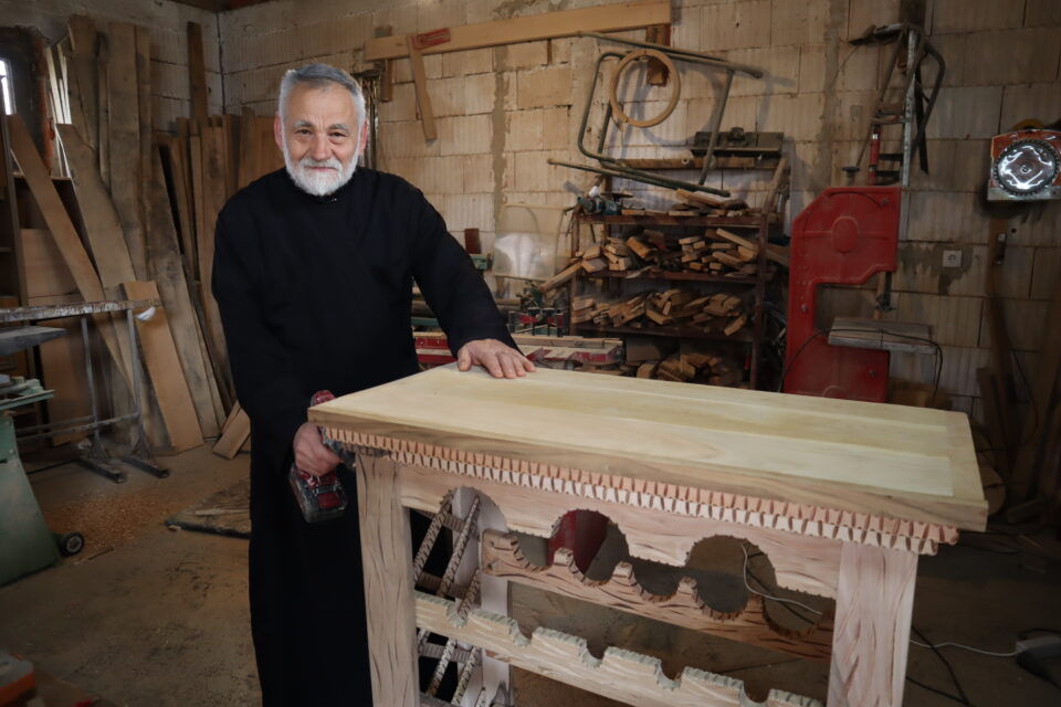 – Израђивао сам владици у Вршцу много тога и када су долазили свештеници и други гости у посјету интересовало их је ко то израђује. Затим су кренуле наруџбе, а дешавало се да не могу све да постигнем. И митрополиту Фотију сам направио неколико предмета – рекао је Куђељић који је по одобрењу митрополита постављен за свештенослужитеља манастира Пресвете Тројице у Подновљу.